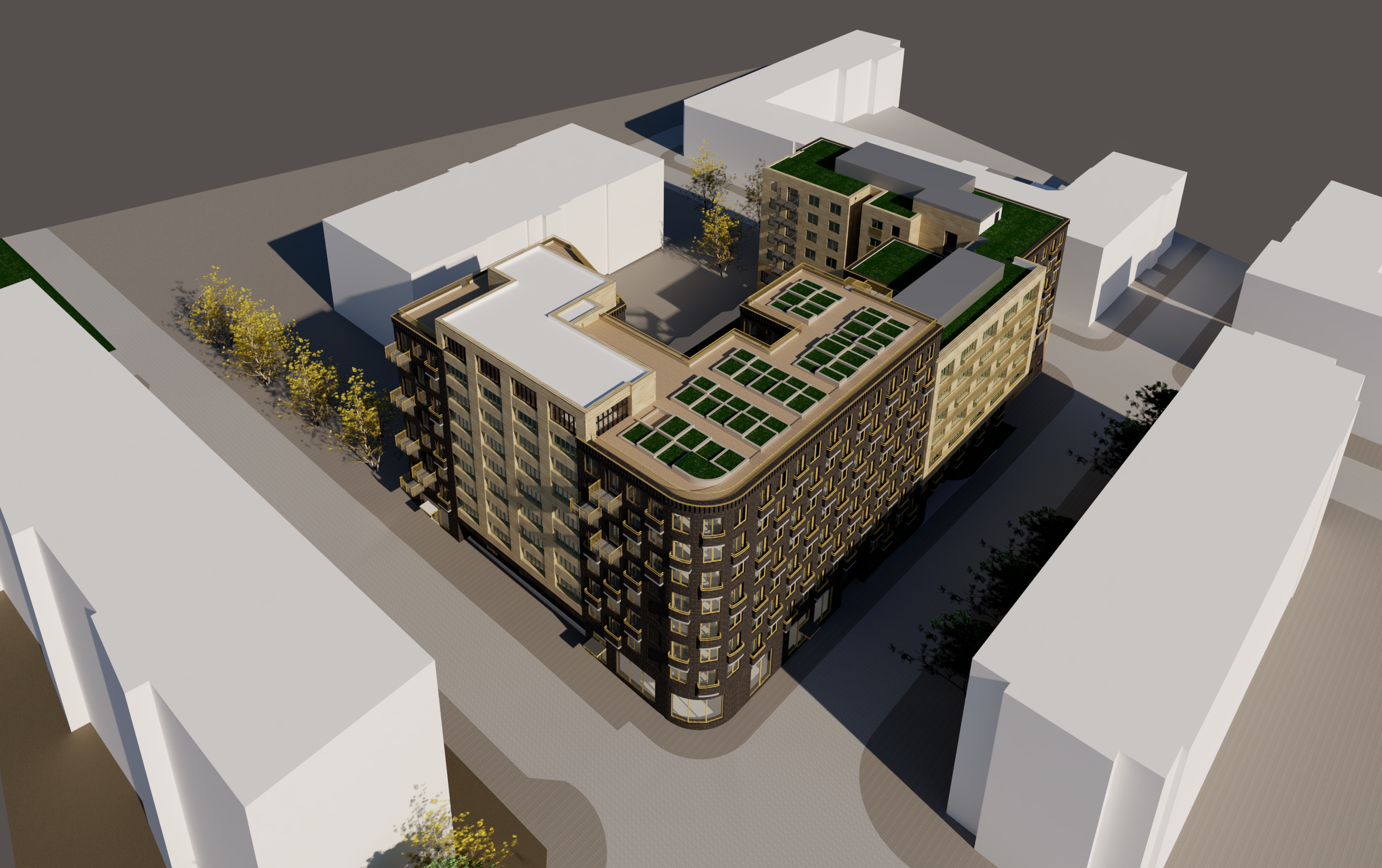 A residential project designed in 2018 to be constructed in Eskilstuna between 2021- 2024. The building was commissioned to consist of 190 residential apartments with a pre-school and commercial spaces residing on the 1st floor. The building was designed with an U-shaped body to embrace the surrounding streetscape while forming a distinct courtyard to be utilized by the pre-school. The street side is characterized by brick architecture, orderly window placement and symmetrical facade detailing while the courtyard facade was given it’s own character with wooden volumes that are linked to the brick facades through a continuous loft corridor system. Throughout the project I was involved from early sketches to developing final detail drawings. This entailed the development of plan solutions for apartments, developing the pre-school layout, and being responsible for the design of the brick facade and main entrance detailing for the pre-school.